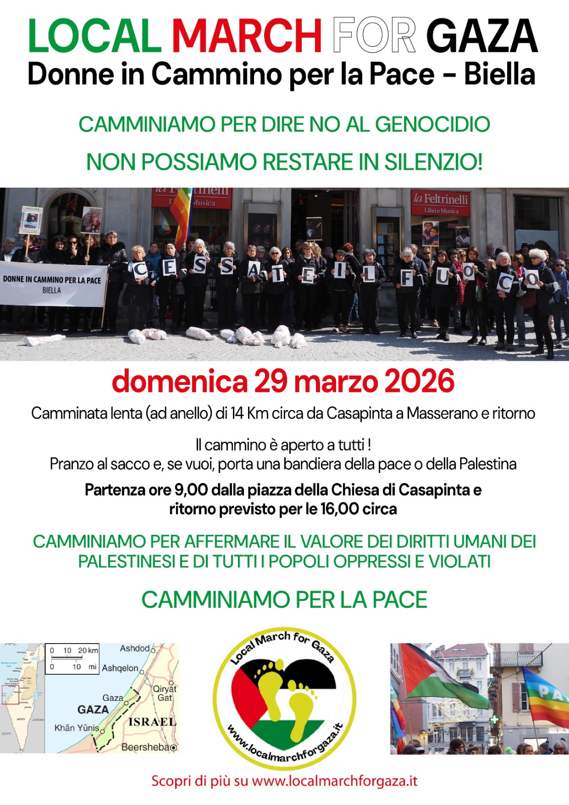 La Local March for Gaza delle Donne in Cammino per la Pace partirà il 22 marzo da Casapinta e farà un percorso ad anello passando da Masserano (BI)